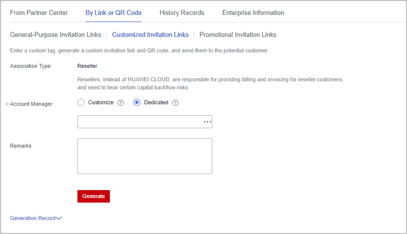 You can click Generation Record to view historical customized invitation links. You can also send a historical invitation link or QR code to a potential customer.