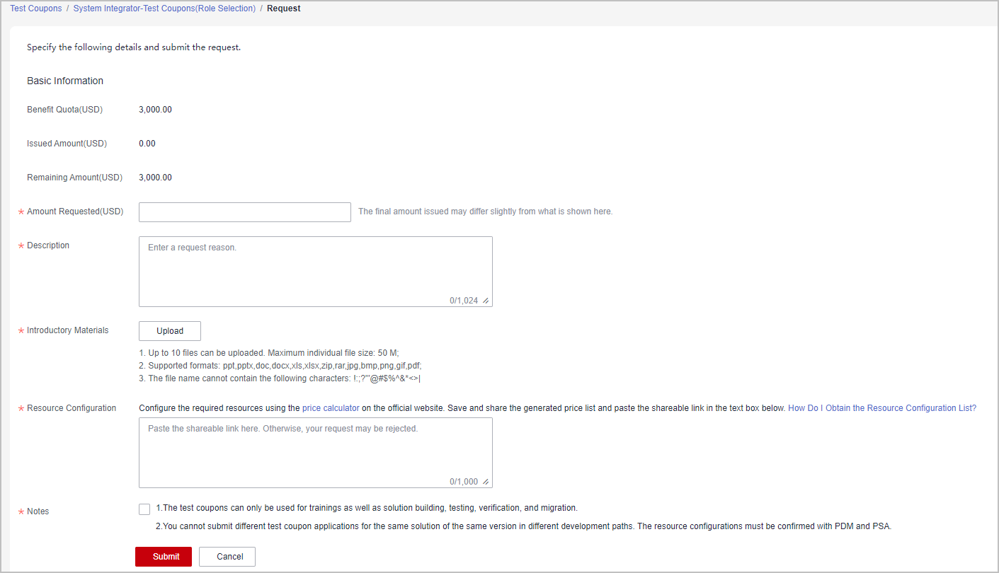 • Amount Requested: The amount in a single request for test coupons provided in the Special Program for Software Partners' Ecosystems on Ascend Cloud/Pangu Large Models, Kunpeng Cloud, GaussDB, or HarmonyOS Applications cannot exceed 50% of the benefit quota.