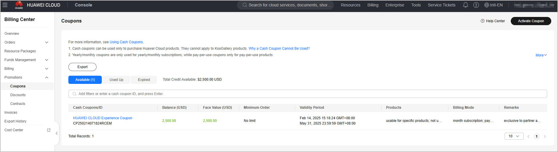 Test coupons are valid for three months of when they are issued. You can access Billing Center > Promotions > Coupons on the Huawei Cloud official website to check the validity period, face value, and usage restrictions of the test coupons obtained.