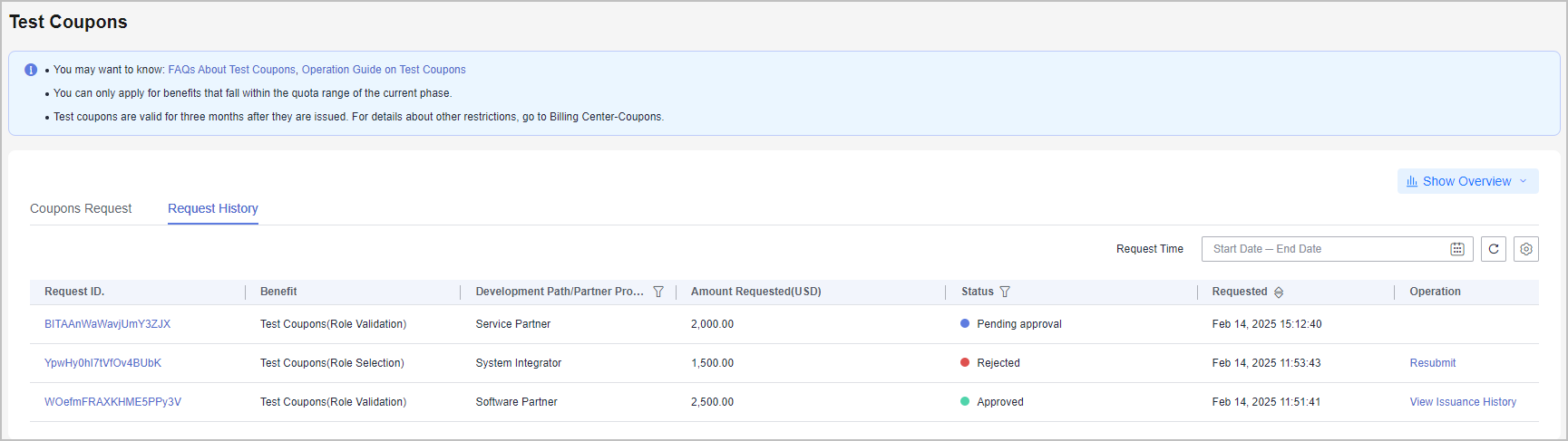 1. Check the request history of a test coupon on the Request History tab page.