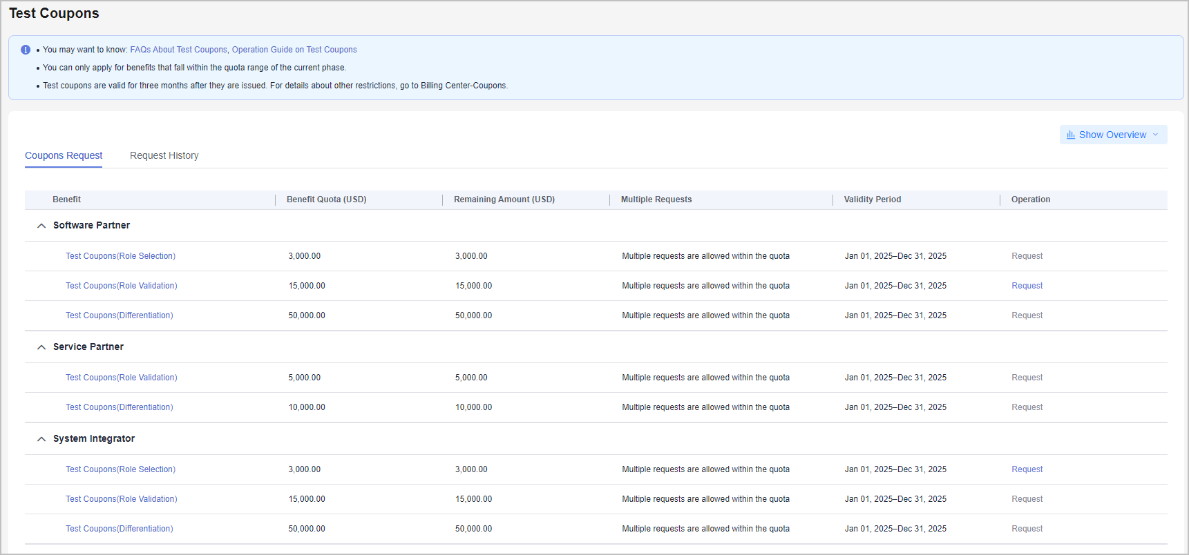 The test coupons are issued to partners for the purpose of training as well as solution and tool building, testing, verification, and migration. The upper limit of this benefit shown in the table on the official website is specific for partners. If a partner has multiple service solutions or application and software solutions, the partner can request this benefit multiple times, but the total amount must not exceed the specified limit for this benefit.