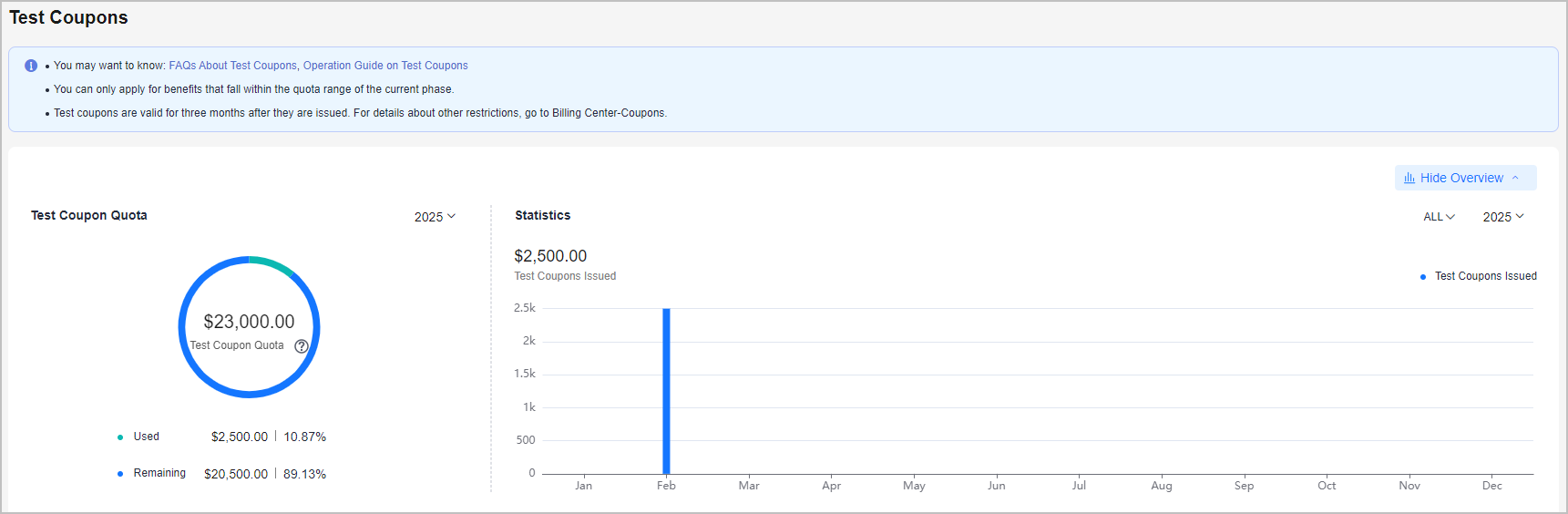 Click Show Overview on the Test Coupons page to show the statistics of the test coupon usage in the current account.