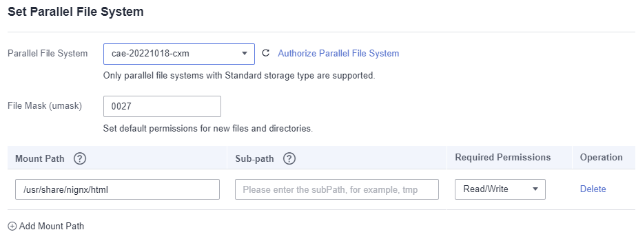 • If a parallel file system is mounted to a sub-path that does not exist, an exception occurs. You need to create the corresponding file or folder in the mounted bucket first.
