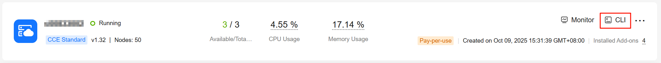 - In the cluster list on the right, locate the target cluster and click CLI tool on the right to use CloudShell.