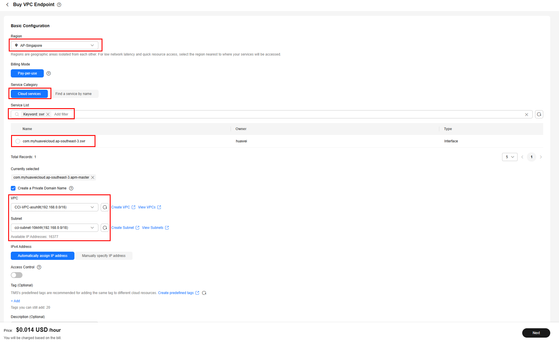 • Set Service Category to Cloud service, search for swr, and select the VPC endpoint service for accessing SWR.