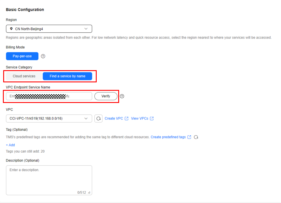 • Set Service Category to Find a service by name. You can obtain the name of the VPC endpoint service for OBS by submitting a service ticket. Enter the service name and click Verify to confirm that the service name is correct.