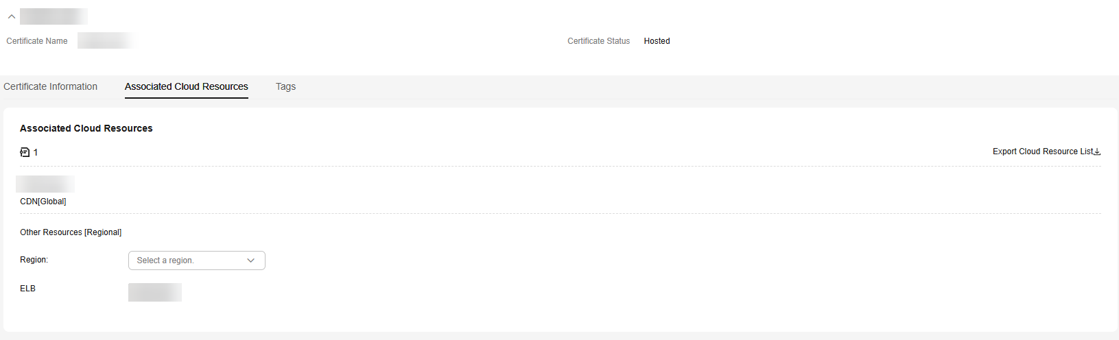 - Select the deployed SSL certificate, hover the cursor over the Name/ID column, and click the target certificate name or ID. The certificate information page is displayed by default. Click the Associated Cloud Resources tab. The Associated Cloud Resources page is displayed, as shown in Figure 1. For details about the parameters, see Table 1.