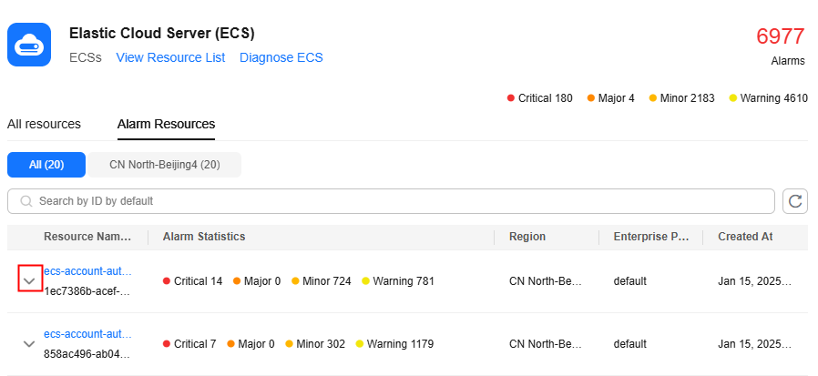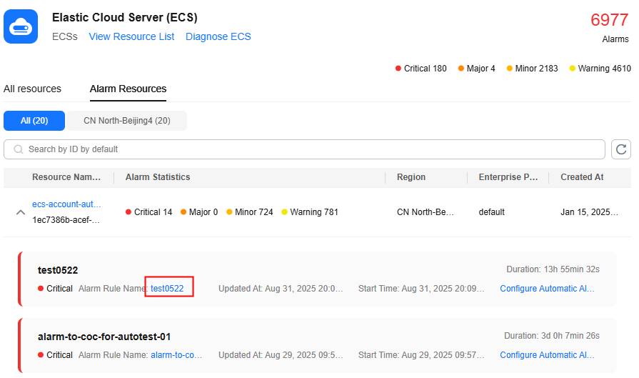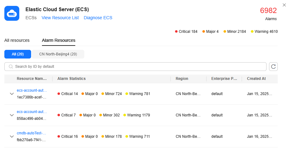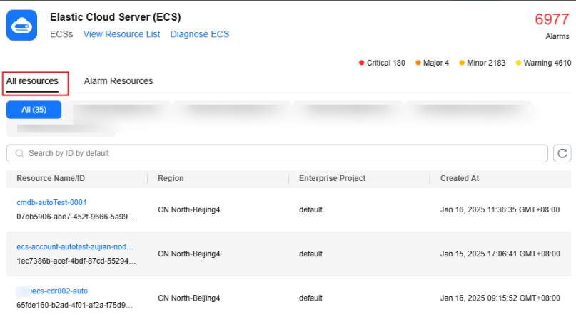 The alarm resource information of the corresponding resource type is displayed.Figure 4 Checking resource information