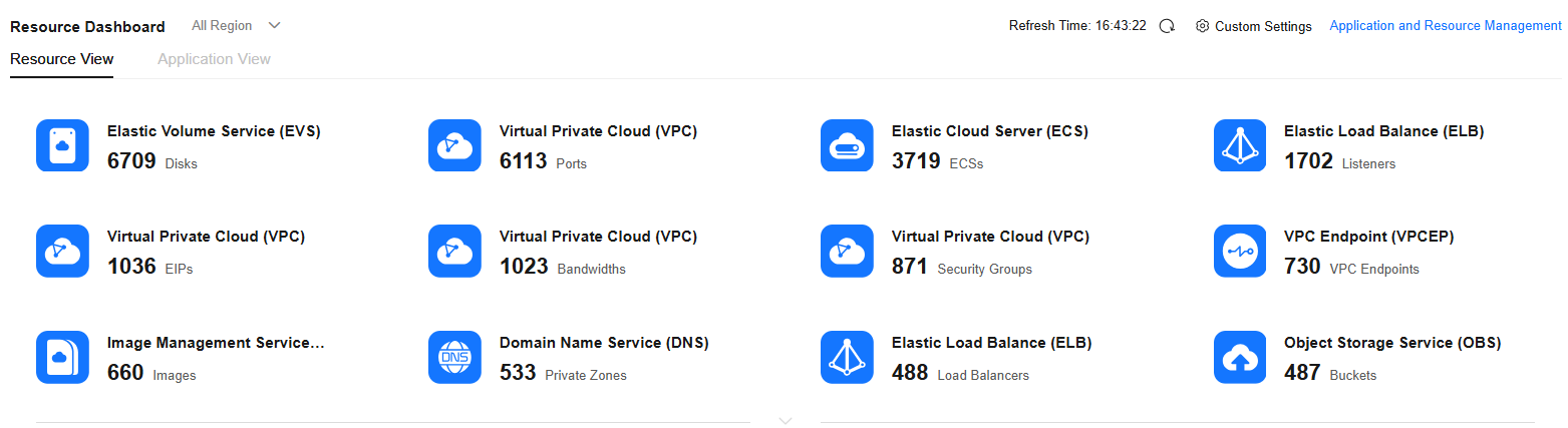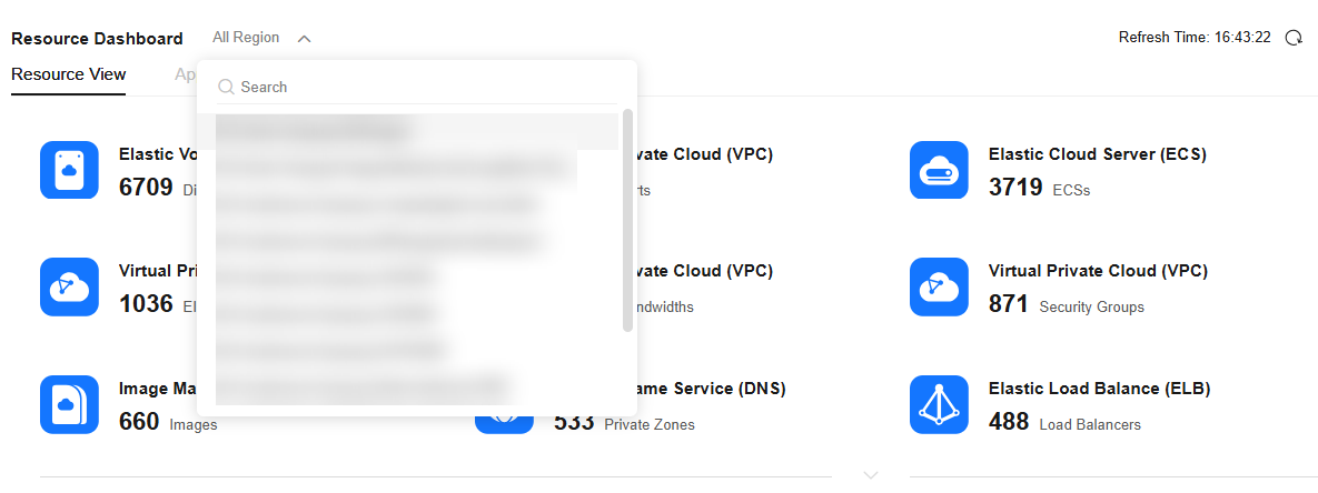 On the Overview page, check the information in the Resource Dashboard area. By default, resources in all regions are displayed.Figure 1 Resource information
