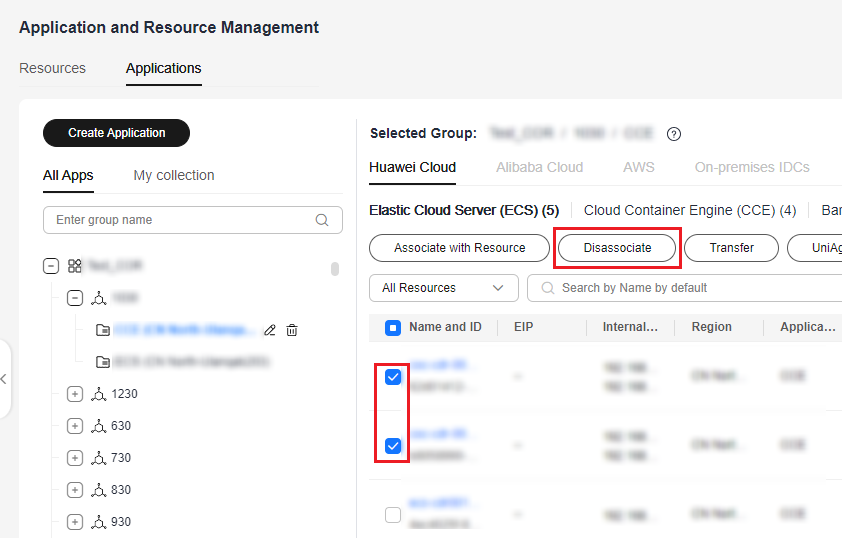 - In the application list on the left, expand the application, select a group, select the resources to be disassociated, and click Disassociate.