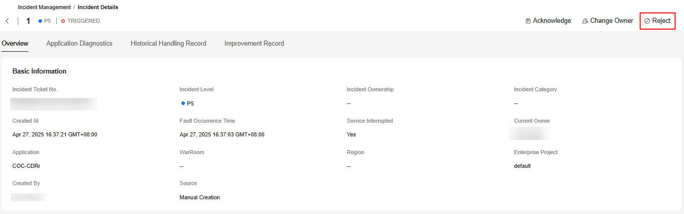After an incident ticket is created, the incident handler can reject it if it is unreasonable or due to other reasons. If rejected, the incident creator can either modify and submit the incident ticket or close it.