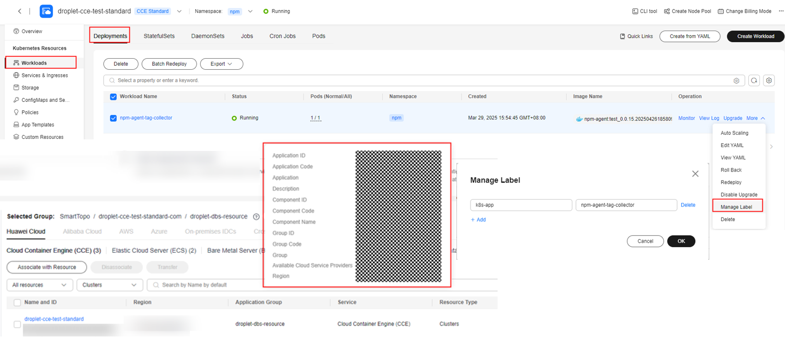 - To display workload and POD information in a CCE cluster, you need to add label to workloads in CCE. (Only one CCE cluster resource can be added to each group. Otherwise, workload information is not displayed.)