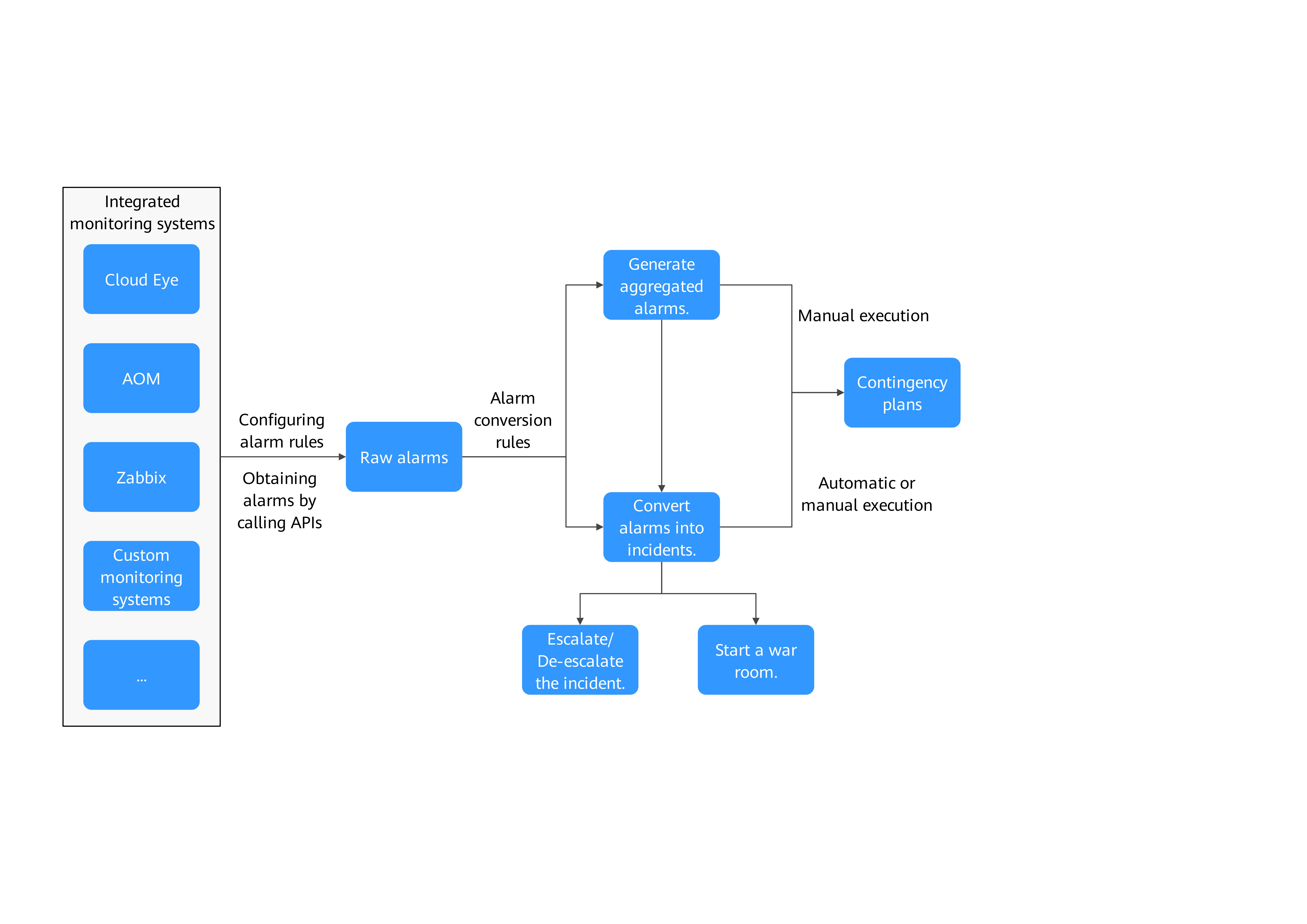 - Generating aggregated alarms based on transfer rules: You can set alarm conversion rules to aggregate multiple raw alarms that match a specific rule into one alarm, which is called an aggregated alarm.
