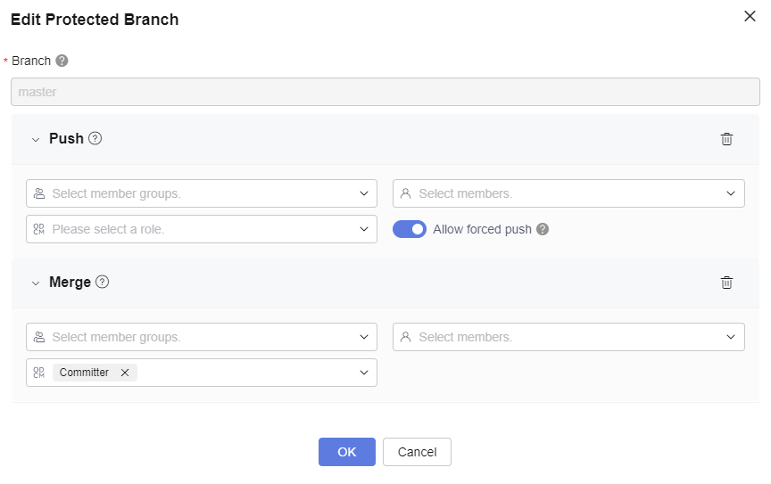 After Allow forced push is enabled, users who have the branch push permission can use the force push command to overwrite the protected branch, but cannot delete the branch. If you have selected Prevent git push-f command in Commit Rules, this function will be invalid.