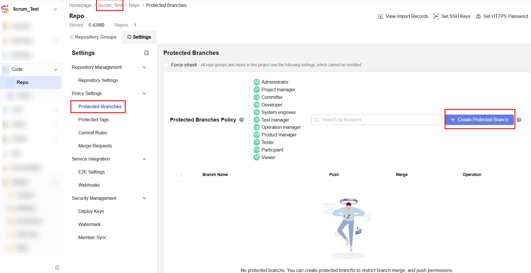 - On the CodeArts Repo homepage, access the Scrum_Test project. In the top navigation bar, choose Settings > Policy Settings > Protected Branch and click Create Protected Branch.