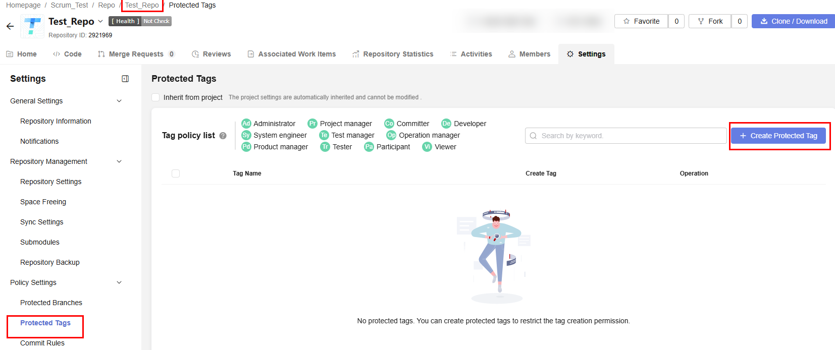 - Go to the homepage of the repository Test_Repo, choose Settings > Policy Settings > protected tags, and click Create Protected Tag.