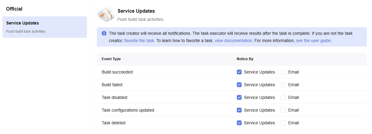 CodeArts Build can send you event notifications on your build task updates, including success, failure, disabling, changes, and deletion.