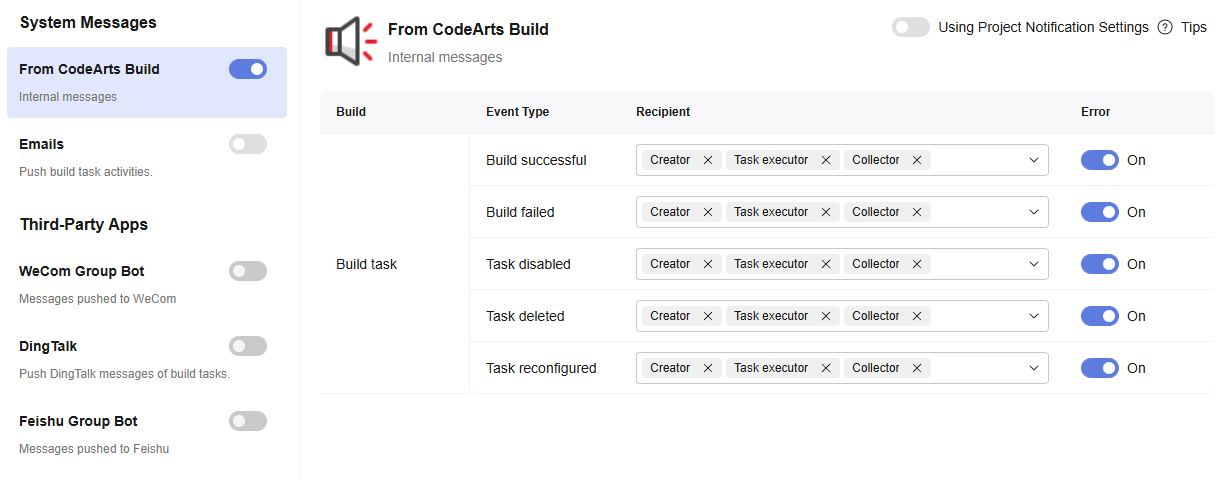 By default, recipients are notified about every event via CodeArts Build messages. However, email notifications are not enabled for any event types by default. You can control which events trigger notifications and specify recipients for each event type.