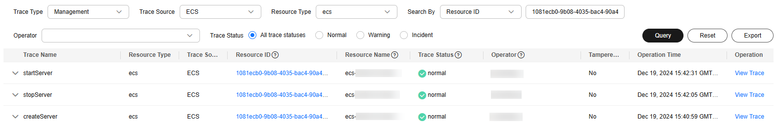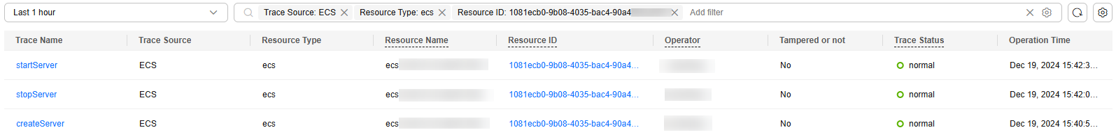 Select Management for Trace Type, ECS for Trace Source, ecs for Resource Type, Resource ID for Search By, enter the ID of the VM, and click Query. By default, the matching traces generated in the last hour are returned. You can also set the time range to view the matching traces in the last seven days at most.
