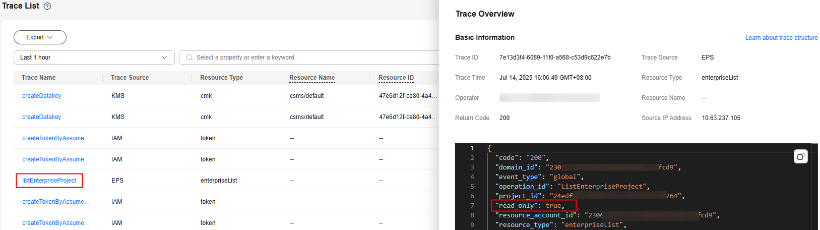 A query trace is a log of a query operation on a cloud service resource. On the CTS console, you can determine if a trace is a query trace by checking the read_only parameter in its details: