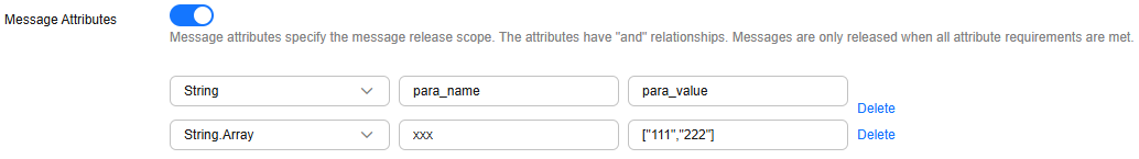 - If you enable Message Attributes, notifications will be sent based on the message attributes. Message attributes specify the message release scope. The system sends messages based on the configured attribute names and values. For example, you can configure different alarm receiving conditions for different personnel. You can configure a maximum of 10 String.Array values. For details about how to configure message attributes, see Using a Subscription Filtering Policy.