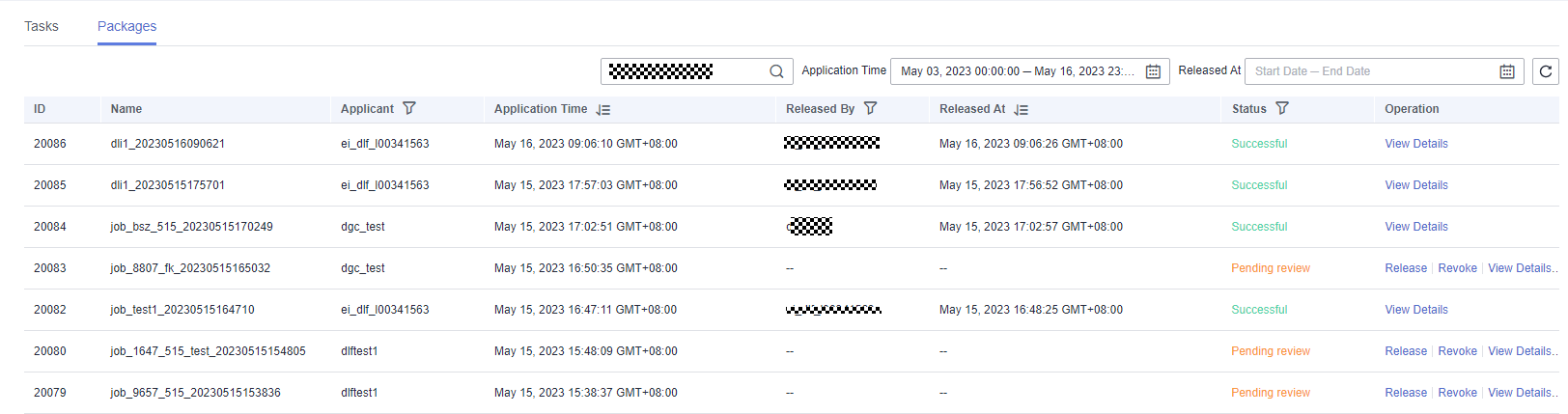 You can filter packages by Applicant, Application Time, Release At, or Released By, and perform fuzzy search using a package name.Figure 2 Viewing the task status
