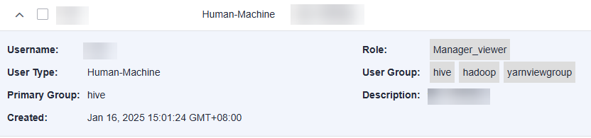 The MRS user must have read and write permissions for the Hadoop and Hive components. You are advised to assign the roles and user groups shown in the following figure to the MRS user.