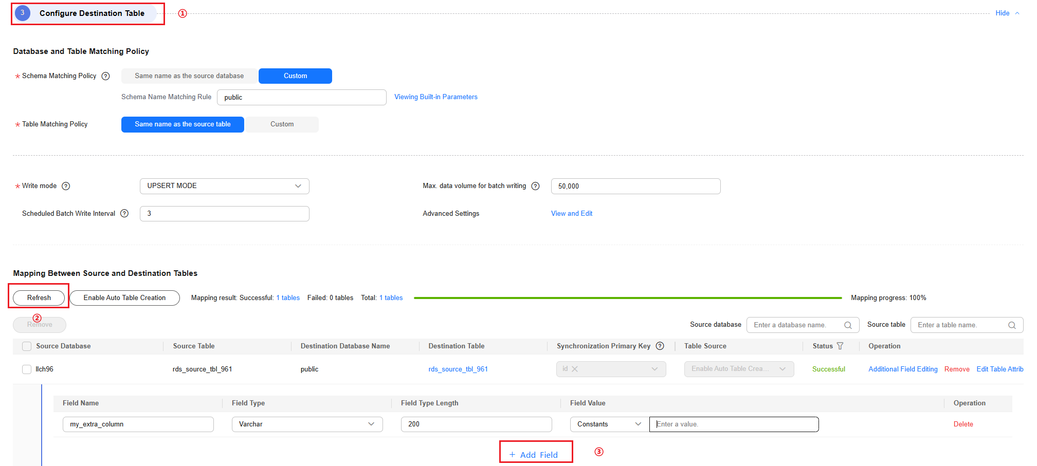 • When adding additional fields to an existing table, ensure that the destination table structure contains the additional fields. Otherwise, the job may fail to be executed.