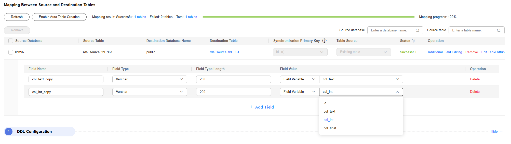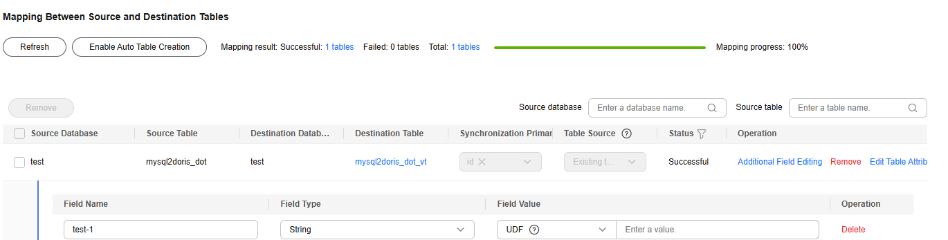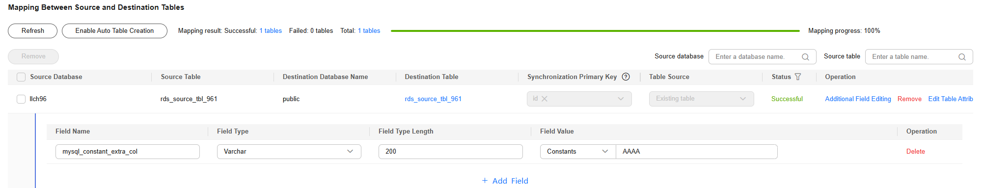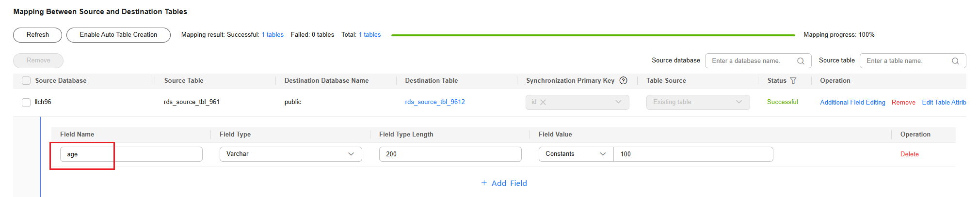 • If the name of an additional field is the same as that of an existing field at the source, the table may fail to be automatically created, and a message is displayed indicating duplicate name. In this case, you need to manually create a table.