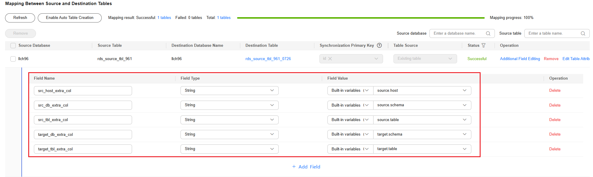 • You can add an additional field to the destination table. The value of the additional field can be the conversion result of an existing field in the source table or the metadata related to the source and destination database tables.
