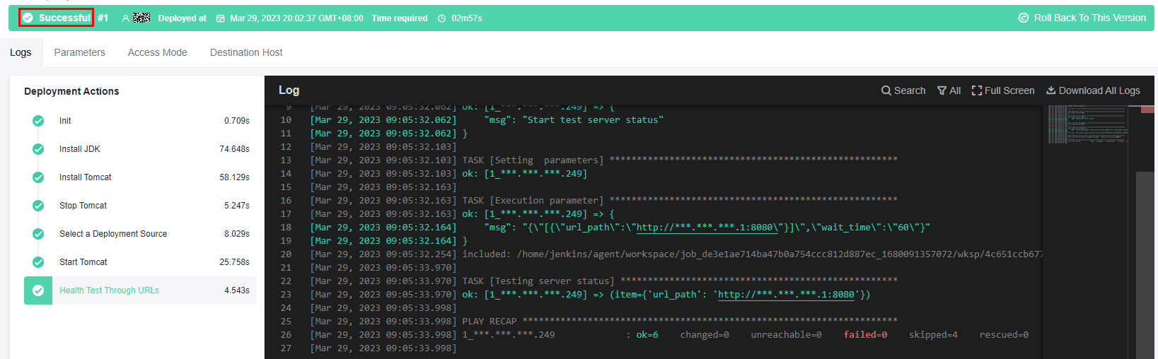 - After the deployment is complete, click the application name and click the target deployment record. The application status bar changes to green and the message Successful is displayed, indicating that the application is successfully deployed.