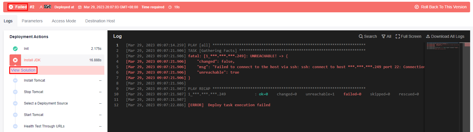 If the application status bar turns red and displays Failed, the application fails to be deployed. In this case, click View Solution.