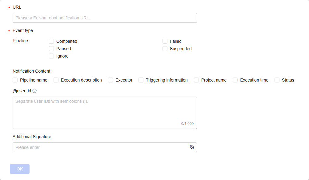 Enter the webhook URL of your Feishu robot, and start with http:// or https://. The URL cannot exceed 256 characters.