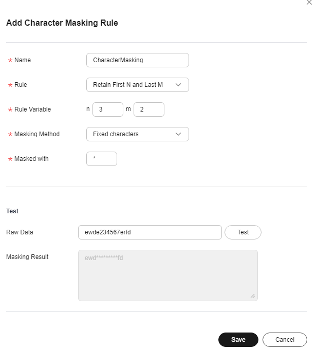 - Configure the parameters by referring to Table 3. Enter the raw data and click Test. The masking result will be displayed in the Masking Result text box.