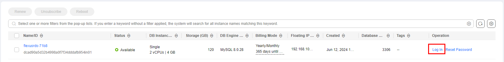 1. In the instance list, locate the target DB instance and click Log In in the Operation column.