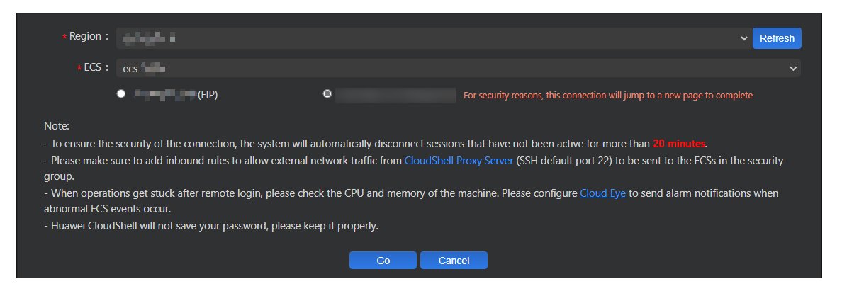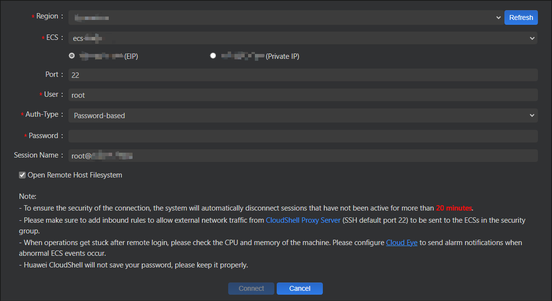 Upon the first login, the CloudShell wizard is displayed by default. You need to enter the instance information for connection.