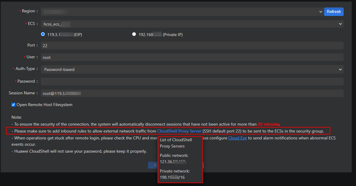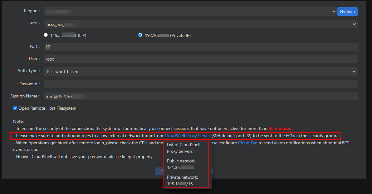 - Ensure that the remote port (default SSH port: 22) of the CloudShell proxy IP address is allowed in the security group. Otherwise, the FlexusX instance cannot be connected. The CloudShell proxy IP address varies depending on the region. The actual proxy IP address will be displayed on the CloudShell configuration page. For details about how to configure security group rules, see Configuring Security Group Rules for a FlexusX Instance.