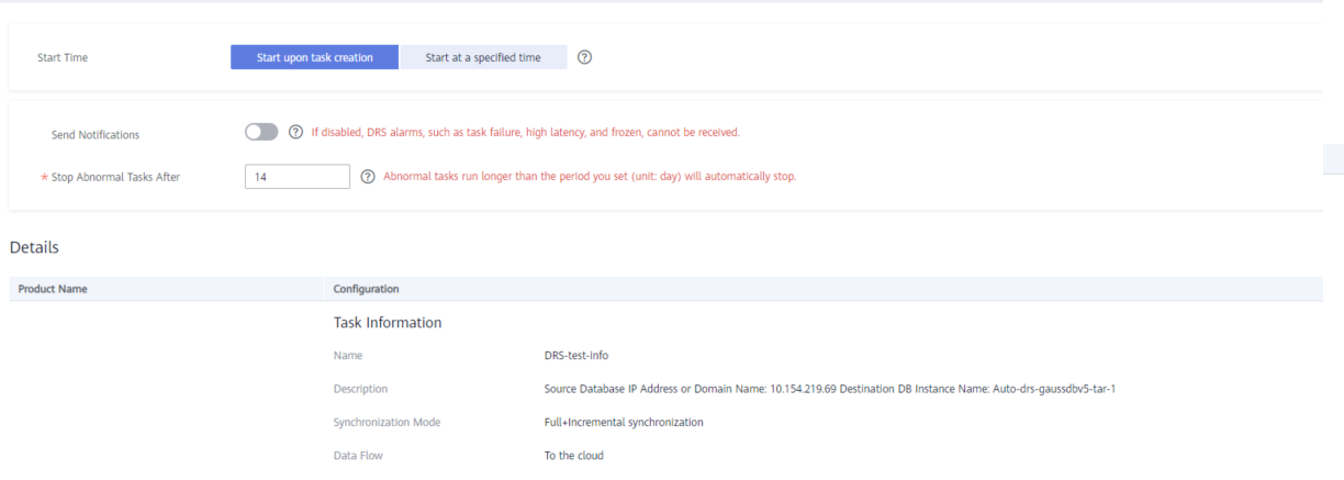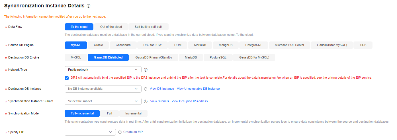 - Specify Data Flow, Source DB Engine, Destination DB Engine, Network Type, DRS Task Type, Destination DB Instance, Synchronization Instance Subnet (optional), Synchronization Mode, Specifications, AZ, and Tags (optional).
