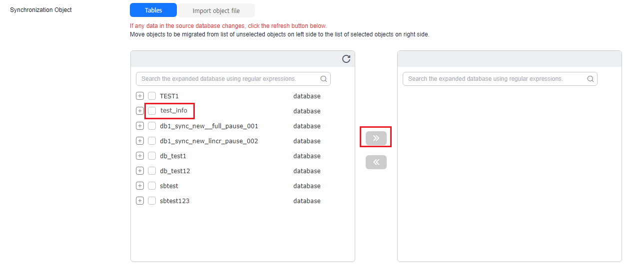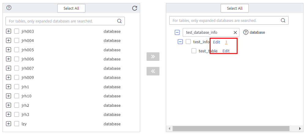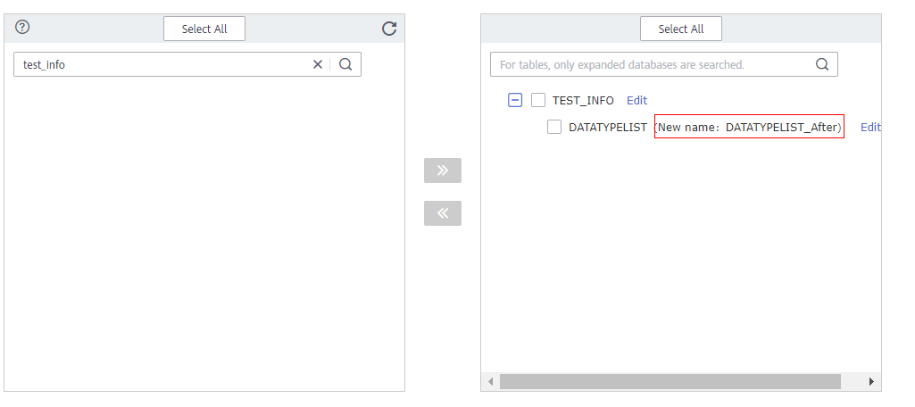 - Select the databases and tables of the source database to be migrated. In this example, select the test_table table from the test_info database.