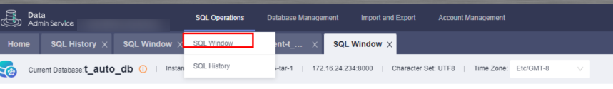 - Choose SQL Operations > SQL Window on the top menu bar.