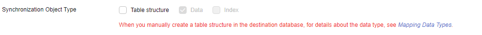 - Select the object type for full synchronization. If the table structure to be synchronized has not been created in the destination database, select Table structure (the table structure contains primary keys and unique keys) for Synchronization Object Type. Otherwise, deselect Table structure. Select Index for Synchronization Object Type as needed.