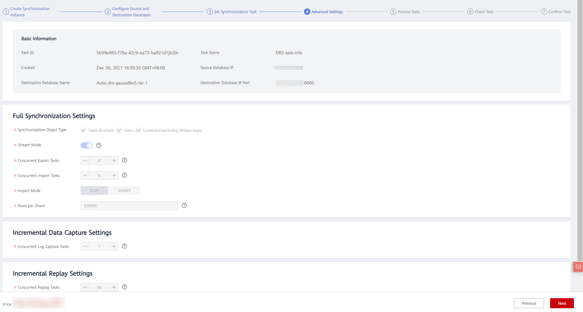 - Configure the source and destination database information.