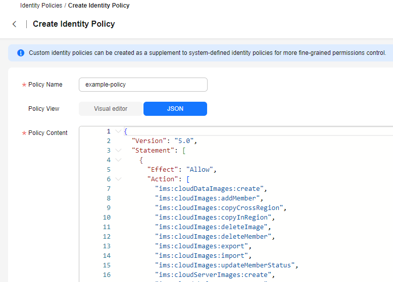 If system-defined identity policies cannot meet your requirements, you can create custom identity policies based on the actions supported by each cloud service for more refined access control.