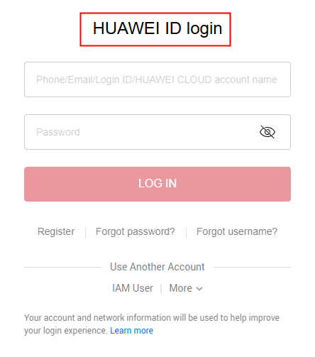 - Logging In Using a Huawei Cloud Account: Use your Huawei Cloud account to log in. If this is the first time you use Huawei Cloud, sign up for a HUAWEI ID and enable Huawei Cloud services.