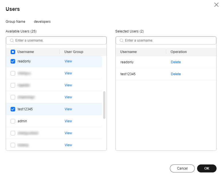 1. In the user group list, click Manage User in the row containing the target user group, for example, developers.