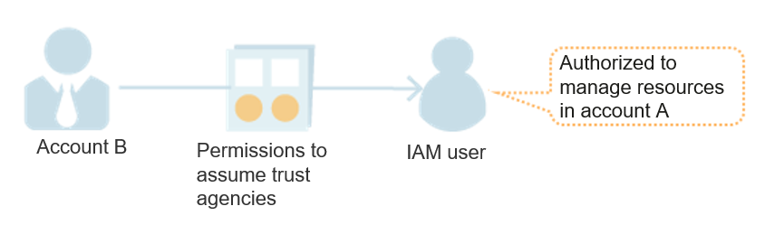- Account A creates a trust agency in IAM to delegate resource access to account B.