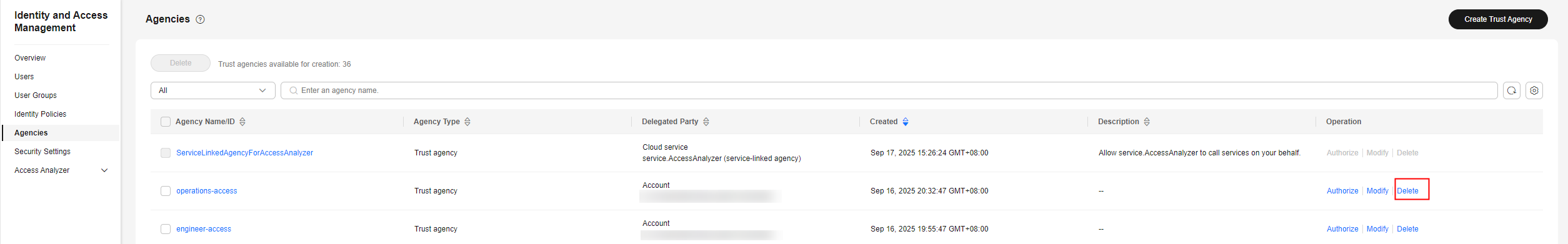 If you no longer need a trust agency, click Delete in the row containing the trust agency to be deleted and click OK. Before deleting a trust agency, delete the assigned permissions defined by identity policies and ensure that services will not be affected after the trust agency is deleted.