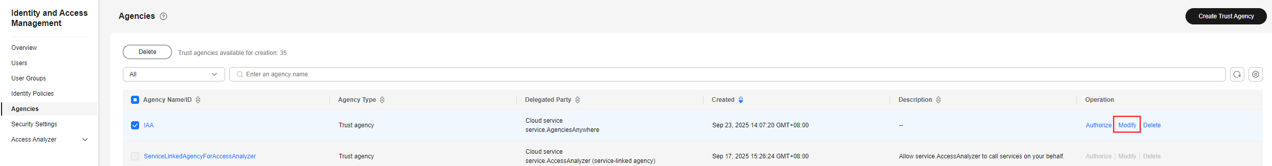 1. To modify the description and trust policy of a trust agency, click Modify in the Operation column.