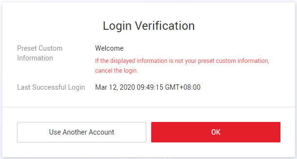 Configure whether you want the system to display the previous login information after you log in. If incorrect login information is displayed on the Login Verification page, change your password immediately.