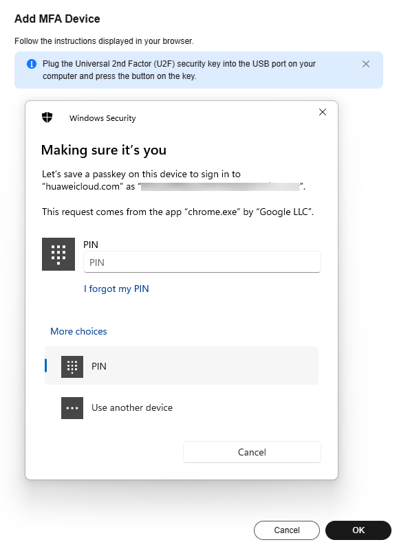 - Enter the PIN (or recognize the face or fingerprint). After the system authentication is successful, a dialog box is displayed, indicating that the binding is successful. Click OK. The security key will be displayed in the MFA device list.